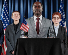 Black Male Politician and Associate Shaking Hands in front of Flashing Cameras